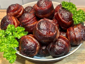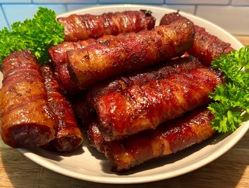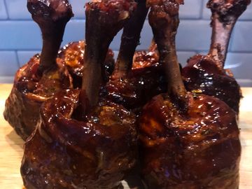 Chicken Drumstick shaped, seasoned, wrapped in bacon, smoked, glazed, finger lickin good