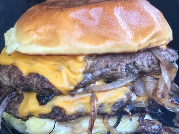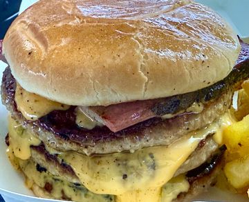 Three all beef patties, cheese, onion, brisket, burger sauce.. O.G.